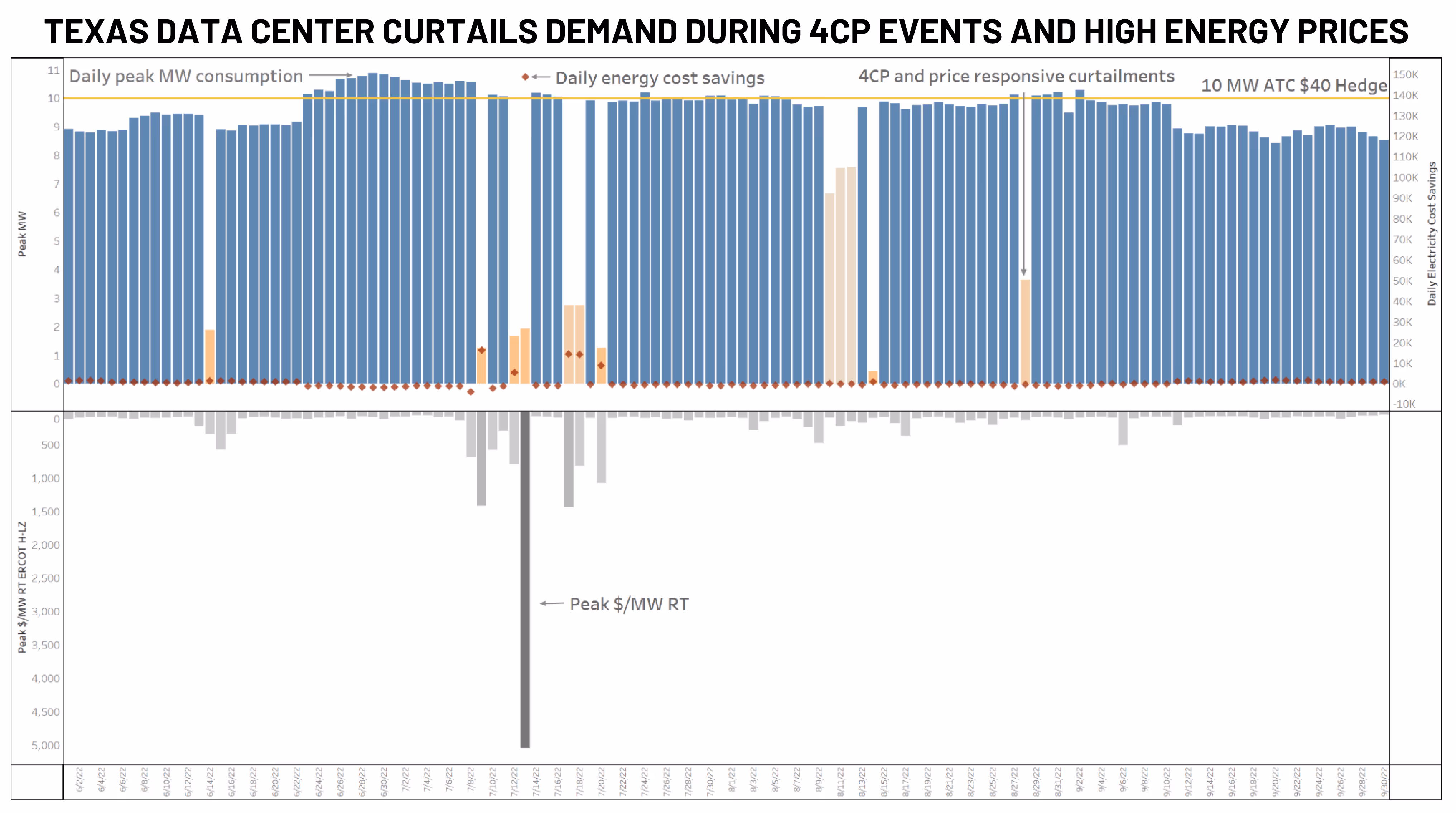 For example, the 10 MW data center below purchased a CAL22’ ATC strip at $40 to hedge their 2022 consumption. During the summer, ERCOT’s real-time prices met or exceeded $500/MWh for over 1800 hours. This data center seized the opportunity to reduce its energy spend by more than $200k by shutting down for only 18 of those hours and selling its hedge back into the market.