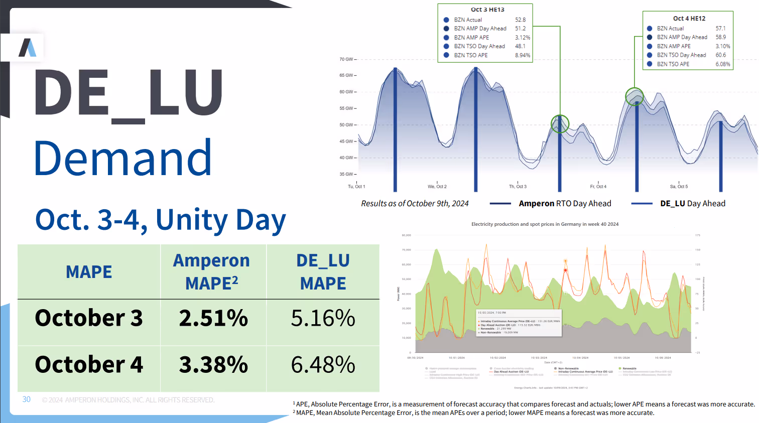 On October 3rd, energy prices peaked around 7 PM, with intraday prices surpassing those of the day-ahead auction. During this time, demand was approximately 1.5 GW higher than TSOs' DE_LU’s day-ahead forecast. Amperon’s APE was 0.59%, and our forecast projected higher day-ahead demand than DE_LU’s, signaling the potential for increased prices.