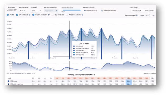 - January 15th: At the peak load hour, HE19, Amperon’s APE was 0.04% and was 0.35% at HE10, the peak load in the morning