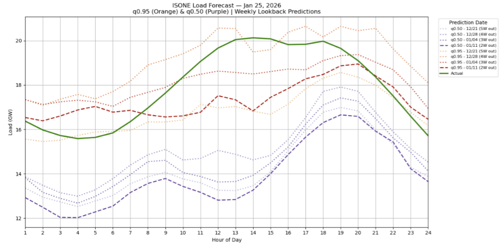 - December 16: The MTF ensemble members first flagged ~20.1 GW demand for January 25 when ISONE Massachusetts Hub Peak Futures were around $100 (Jan 25) and $143–$145 (Jan 26–27).
