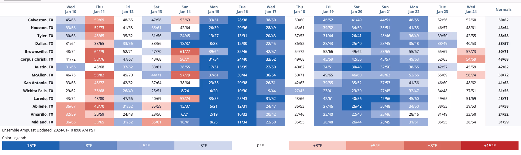 Early next week, expect record cold weather during what climatologists view as the coldest time of the year. This will mean elevated electricity demand for most of the country, especially in ERCOT where things might get extremely risky on the grid in the early mornings if wind doesn't show up.
