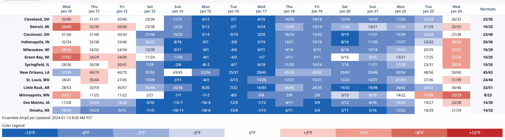 Cold starting January 14th, especially in the western part of PJM where Chicago will have sub-zero temperatures three days in a row.