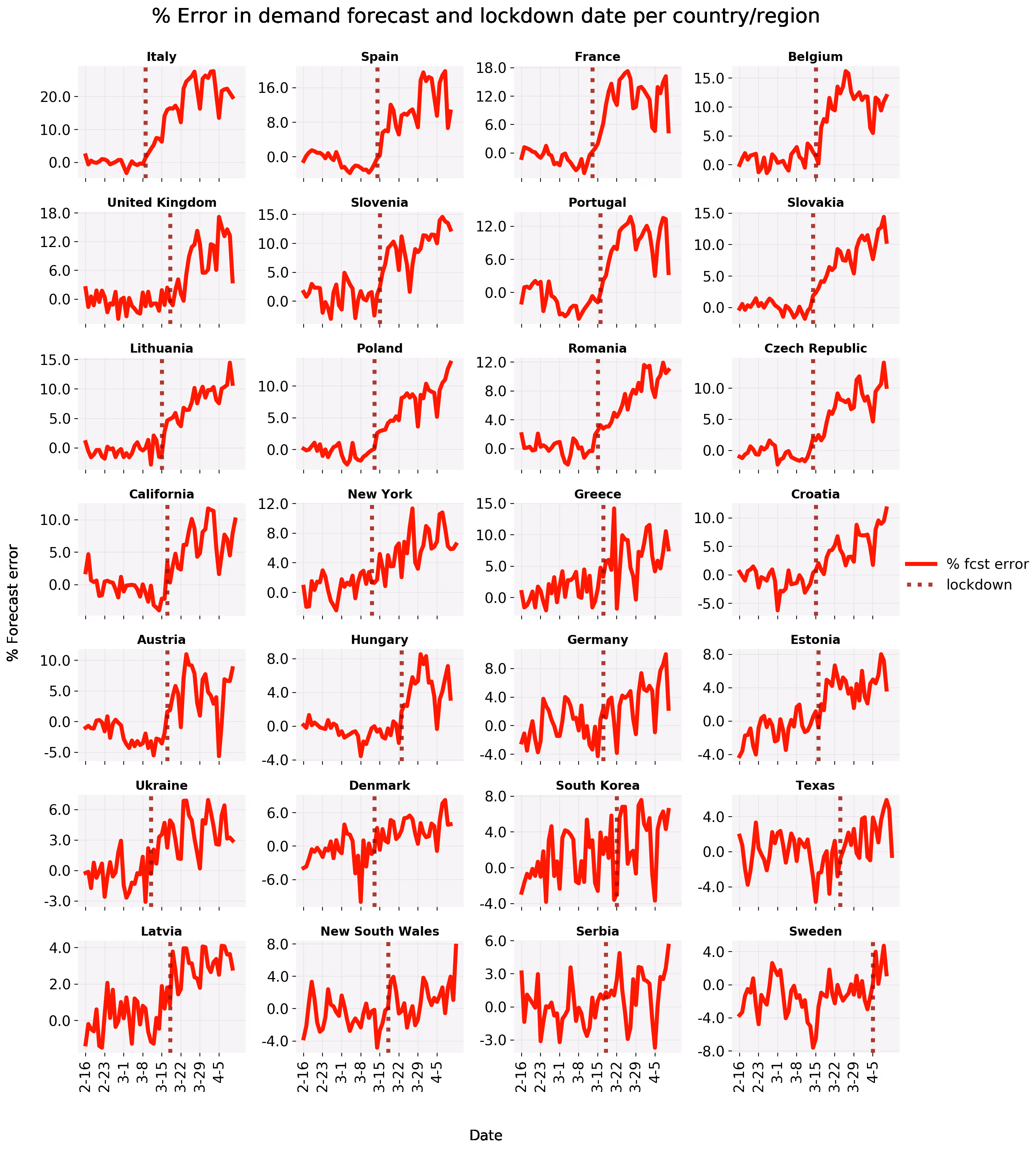 In the second and third plot we show over time the demand actuals and forecast, respectively the percentual forecast error, both annotated with a vertical line for the apparent lockdown date. For some regions the model fit is accurate, demand reduction is sudden and strong, the lockdown date is visually obvious and corresponds with the official lockdown date (Italy). For other regions demand reduction happens more gradually (New York), the fit is noisy (South Korea), a day of week pattern can be spotted (Germany) or you see what happens when a country decides not to lock down (Sweden). Interestingly, for Italy, France, Belgium, Portugal, California and Austria, demand reduction already seems beyond it’s maximum, but we’ll have to wait and see if this is really the case.