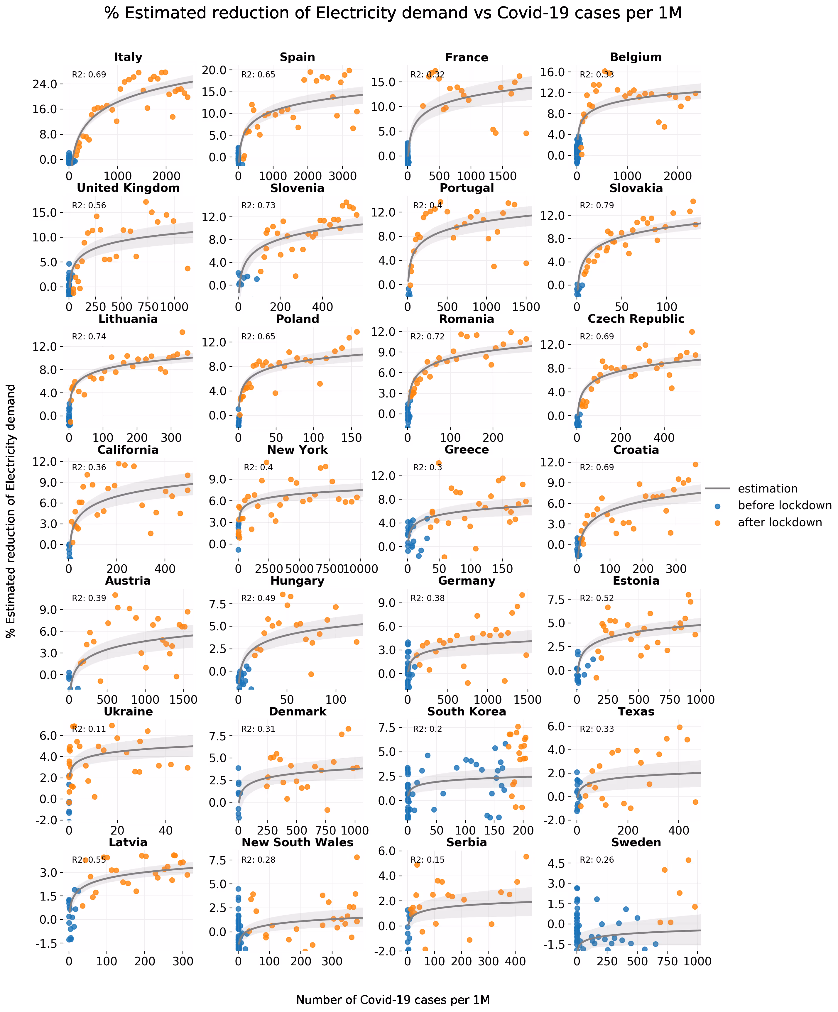 For the fourth plot we combined the estimated electricity demand reduction in a scatterplot with the number of Covid-19 cases before and after lockdown and fitted a logarithmic trend on the data after March 1 2020. Though the logx doesn’t cover a complete or perfect fit, for many regions it captures the relatively steep reduction at the first cases, which then flattens when the outbreak matures.