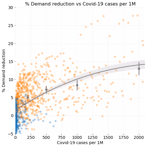 Indicating (again) how much the impact can vary between regions, in the seventh plot we show the data for the two regions in Europe with the highest per 1M Covid-19 numbers (Italy and Spain) and the three regions we investigated in the US (New York, Texas and California). Though towards 3000 per 1M, impacts seem to converge around 15%, around 1500 per 1M cases we could still see a huge spread in demand reduction between 5% and almost 30%, showing regions have reacted very differently under similar situations. As cases all around the world are being measured differently, caution though needs to be taken in the interpretation of the amount of Covid-19 cases.