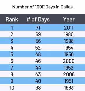 So far this year, 2011 is slightly ahead of 2022 for number of hot days. Dallas had 23 100-degree days in 2011 compared to 21 in 2022. But Houston has seen more hot days in 2022 with 12 days vs 2011’s nine days.