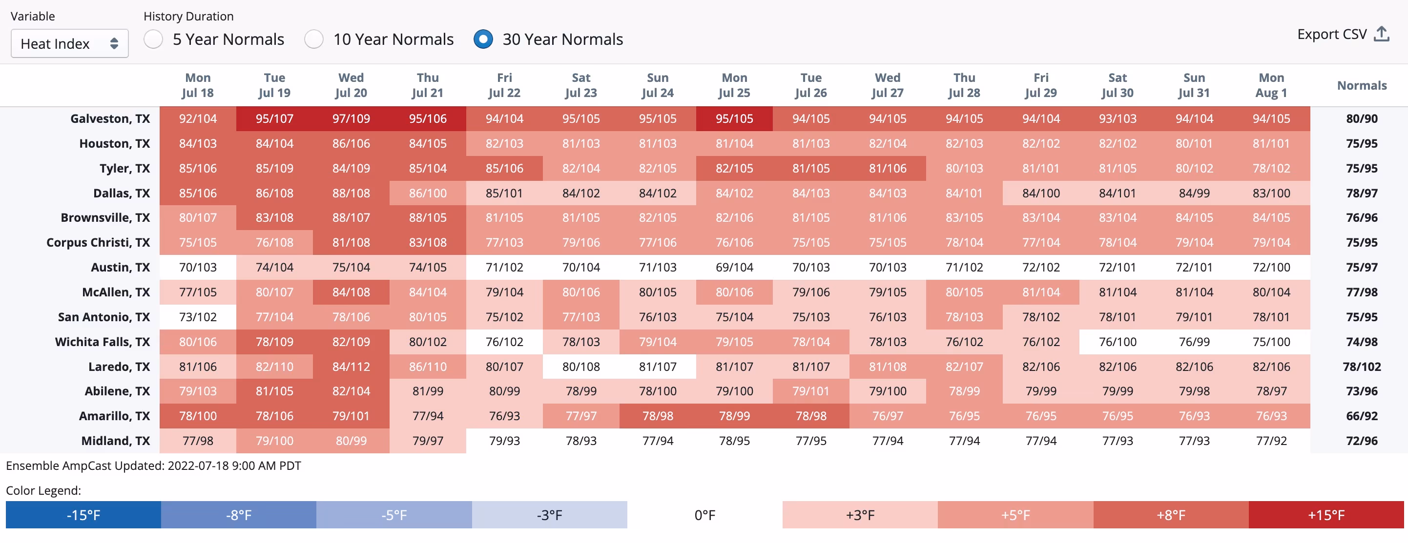 In 2011, Dallas-Fort Worth had 71 days over 100 degrees, with 43 consecutive 100-degree days from July 2-August 12. Houston only saw 40 days over 100. While 2011 had excessive consecutive days of heat, 2022 will have a rare normal day (at least for Texas), followed by increased temps, giving some minor relief to the ACs working non-stop.
