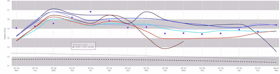 It’s important to also look at national records. If the rest of the country is hot, then Texas will get zero relief. The WDD (Weighted Degree Day) shows a hot start to the week. The dots represent record high demand with some days above the current record.