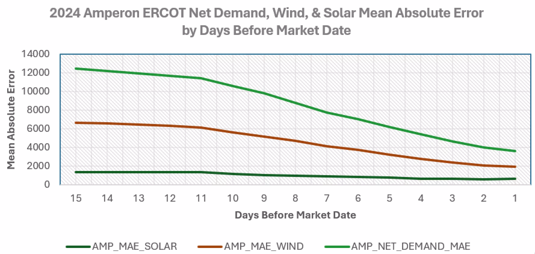 In the first chart below, we see how the Absolute Error decreases, on average, as we approach the forecasted market date in ERCOT for 2024.