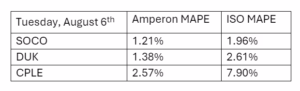 As Monday progressed, the majority of SOCO began experiencing the storm's effects, where Amperon’s forecast continued to outperform with a MAPE of 1.19% compared to the ISO’s 4.59%. By Tuesday, Debby’s impact reached regions like DUK and CPLE in the Carolinas, where the most significant rainfall occurred over a four-day period, with some areas receiving more than 10 inches of rain.