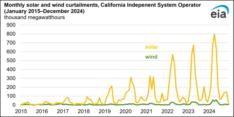California’s solar boom has created a paradox: abundant midday generation that the grid can’t always use. In 2024, CAISO curtailed 3.4 million MWh of solar and wind, a 29% increase from 2023. Solar accounted for 93% of all curtailed energy.